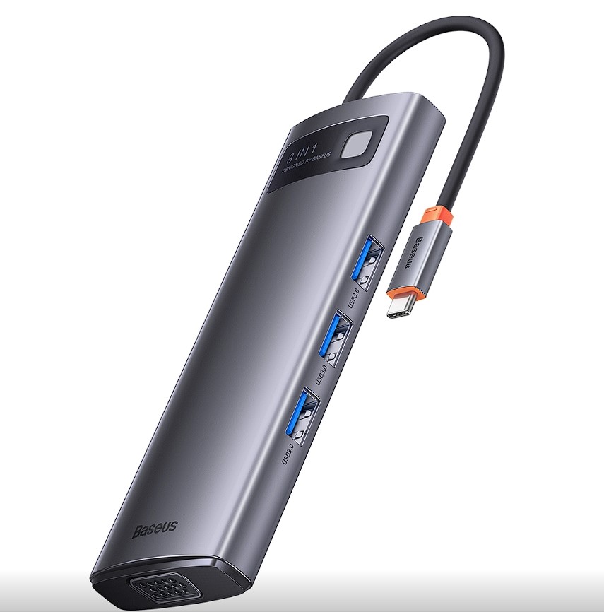 Adaptor Metal Gleam 8in1, Baseus, HUB USB-C – HDMI, VGA, 3x USB3.0, SD, TF 100W, Gri