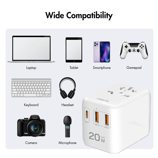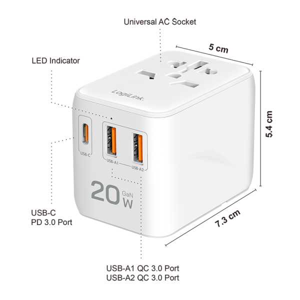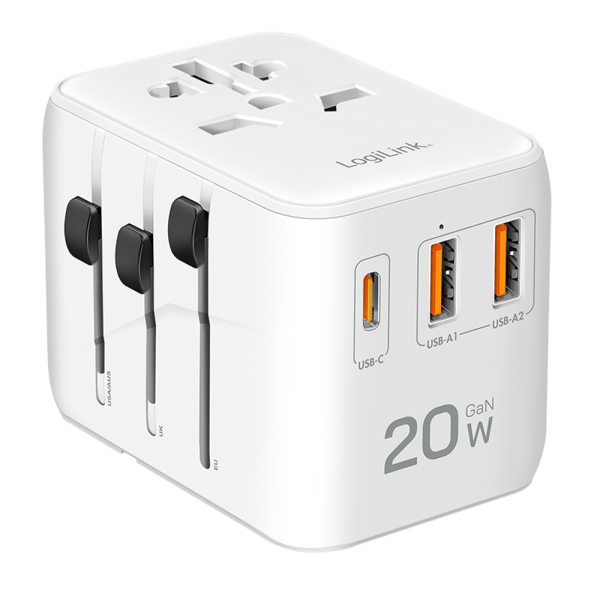 Alimentator retea 220V LOGILINK, universal, 1 x USB-C, 2 x USB-A, suport OCP/OVP/OHP/SCP, compatibil EU/AUS/US/UK, alb