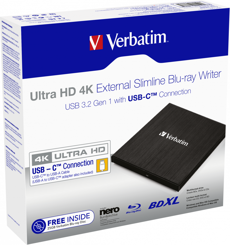 Blu-Ray Writer extern Verbatim Slimline, compatibil M-Disc, USB 3.1 Type-C, Negru