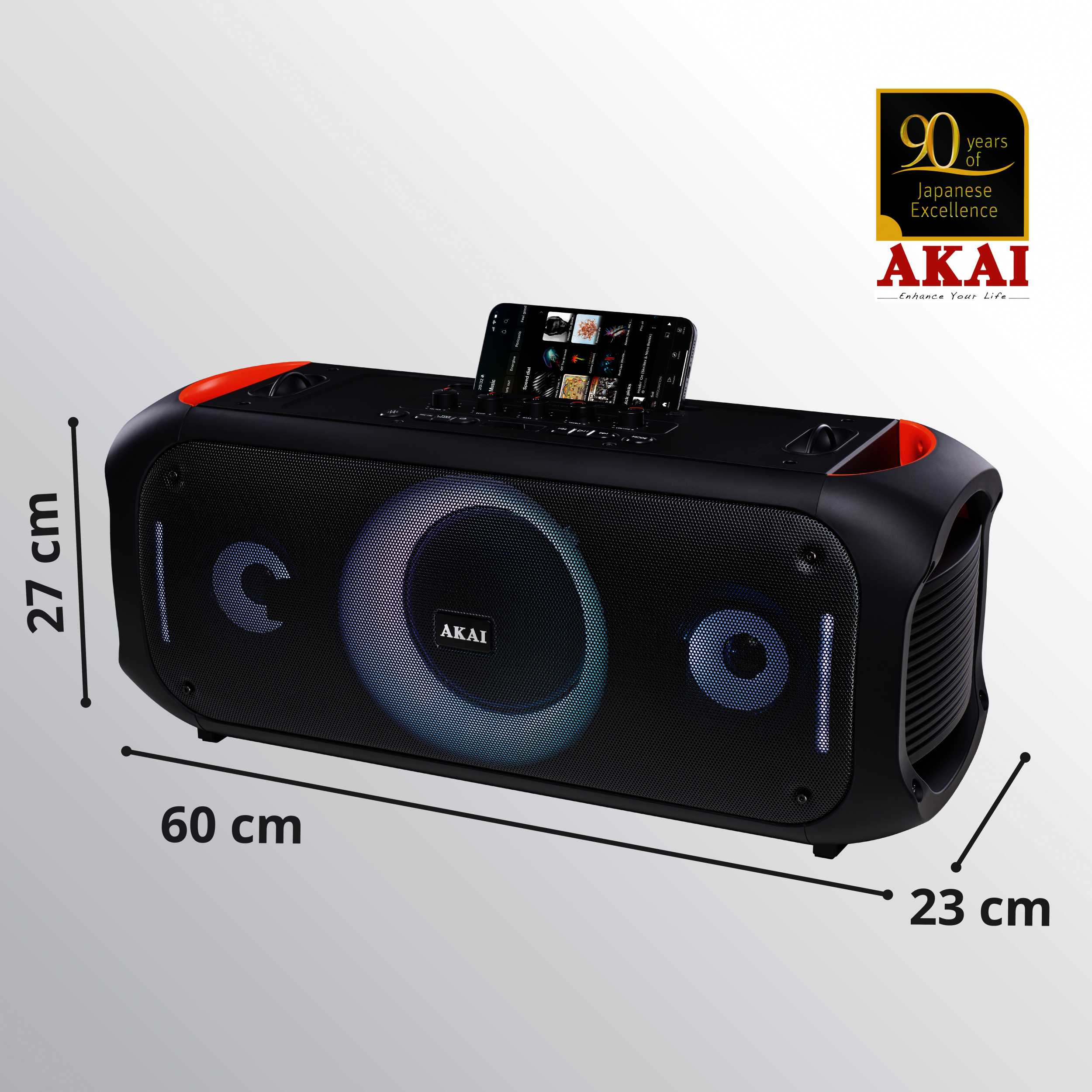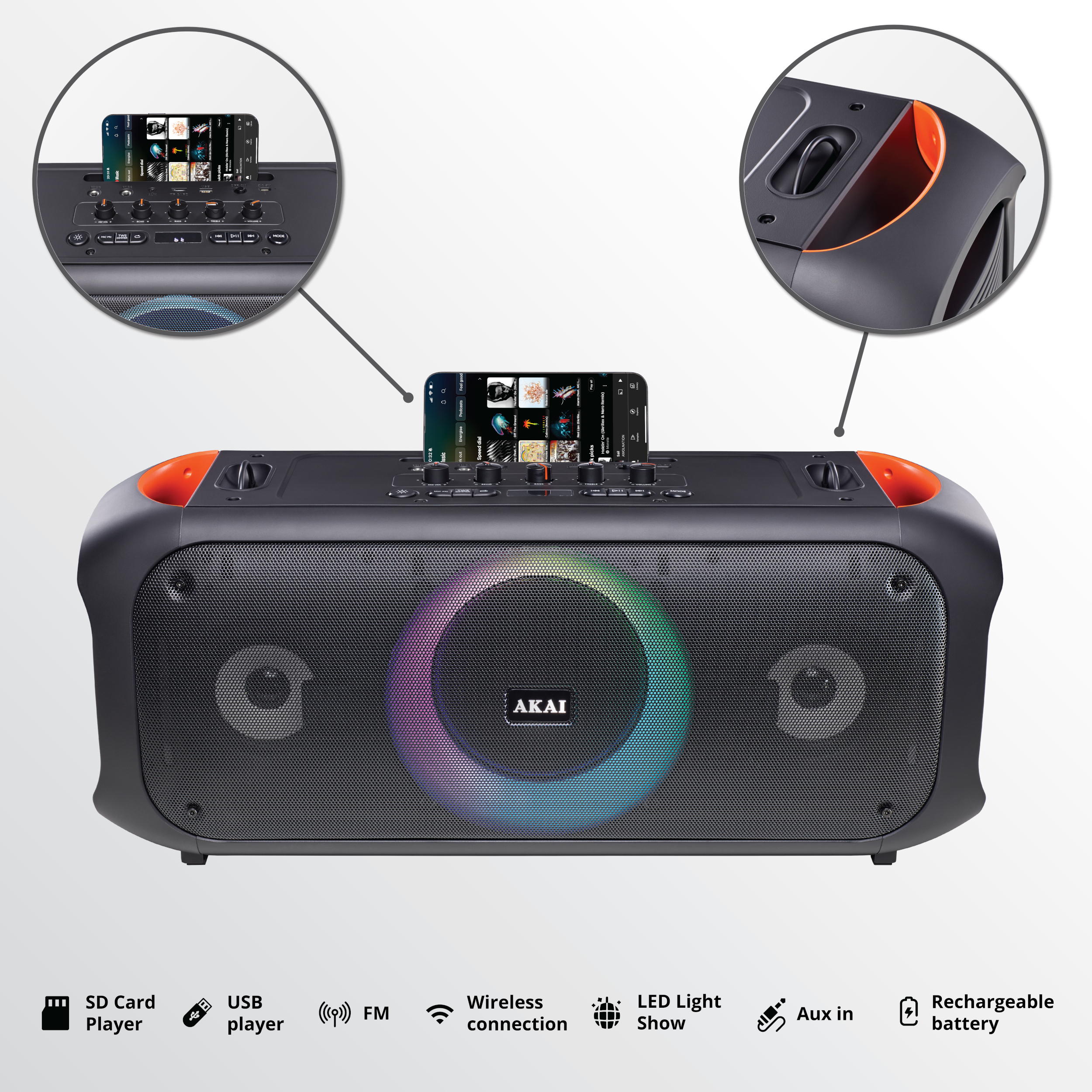 Boxa portabila Akai cu microfon fara fir si telecomanda, bluetooth 5.3 putere 80W, puterea de emisie a canalului BT 2 dbm, baterie 7,4 V, 6000 mAh, tip baterie Litiu-ion, radio FM 87.5-108MHz, frecventa microfonului 2402-2480 MHz, cu intrare AUX, slot USB si card TF, formate audio acceptate MP3, WAV, WMA, FLAC, APE, raspuns in frecventa 60 Hz-18 kHz, timp de încărcare max 6,5 ore (5V/2A), timp de redare 4,5-5,5 ore (80% volum), negru