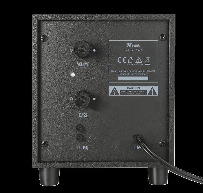 Sistem audio Trust Avora 2.1, lungime cablu audio 130 cm, intrare audio 3.5 mm, frecventa raspuns 100 Hz, 20.000 Hz, putere maxiam RMS 18W, impendanta 4 Ohm, negru