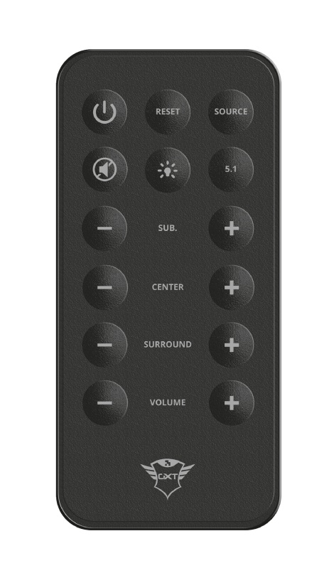 Sistem sunet 5.1 Trust Tytan GXT 658, cu fir, interfata jack 3.5mm, putere 180W, format din 4 sateliti cu fir, 1 satelit central cu fir, 1 subwoofer, frecventa de raspuns: 20 Hz – 20.000 Hz, subwoofer cu LED, include telecomanda cu baterii, negru