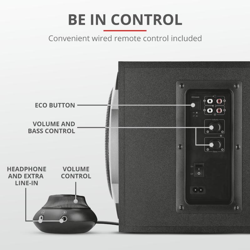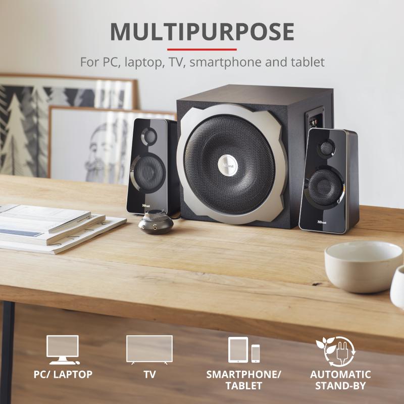 Boxe Trust Tytan 2.1, lungime cablu audio 175 cm, intrare audio 3.5 mm, frecventa raspuns 20 Hz, 20.000 Hz, putere maxiam RMS 120 W, impendanta 4 Ohm, negru