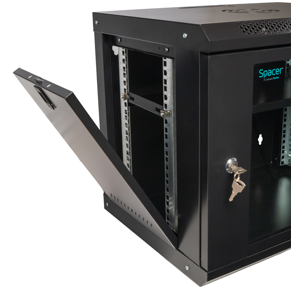 CABINET 19″ SPACER 9U 500x450mm, fixare pe perete, Flatpack (dezasamblat), Black, usa sticla cu blocare, panouri detasabile, otel 1mm, sarcina maxima 25Kg