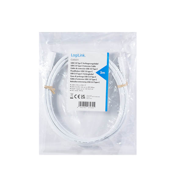 Cablu alimentare si date LOGILINK, pentru smartphone, USB 2.0, USB Type-C (T) la USB Type-C (M), 2m, PD 100W, 2 x ecranat, plastic, alb