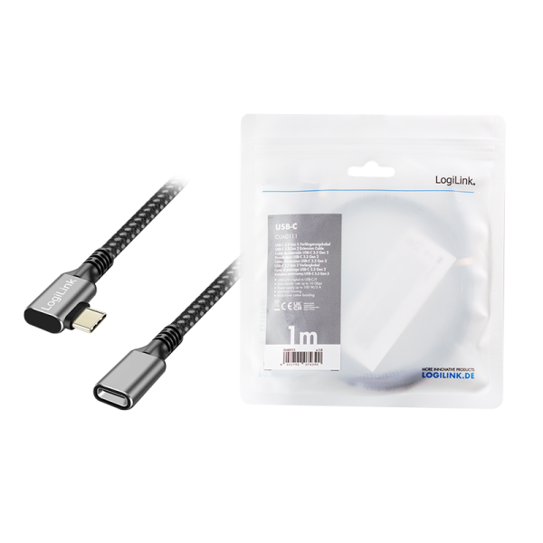 CABLU alimentare si date LOGILINK, pt. smartphone, USB 3.2, USB Gen Type-C (T) la USB Type-C (M) la 90 grade, 1m, PD 100W, 2 x ecranat, aluminiu, braiding, negru&gri, „CUA0111” (timbru verde 0.08 lei)