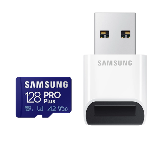 Card memorie Samsung PRO Plus + Cititor USB carduri micro-SDXC, MB-MD128KB/WW, 128GB, „MB-MD128KB/WW” (timbru verde 0.03 lei)