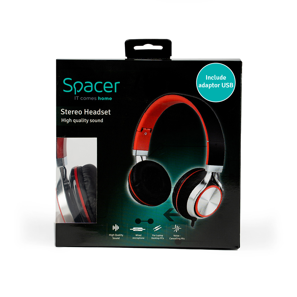 Casti Spacer, cu fir, standard, utilizare multimedia, microfon pe fir, pliabile, banda ajustabila, conectare prin adaptor USB 2.0 sau Jack 3.5 mm x 2, rosu&negru, „SPHS-SILVER-USB”