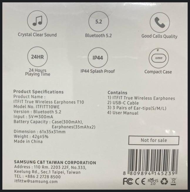 Samsung ITFIT True Wireless In-Ear Buds T10 White (BT5.2, IP44, 24Hrs autonomy, USB-C cable, S/M/L eartips) (garantie doar la NOD)