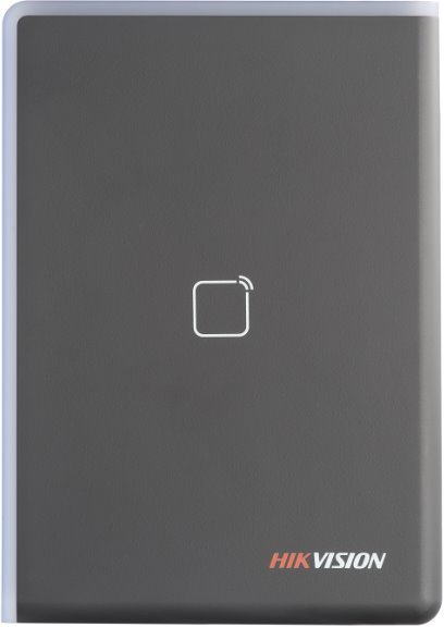 Cititor card Hikvision DS-K1108AE, citeste carduri EM 125 KHz, distanta citire: ≤ 50 mm, comunicare: RS-485, Wiegand (W26, W34) protocol si OSDP protocol, indicator LED de stare si alimentare, tamper, buzzer, alimentare: 12 VDC, IP65, dimensiuni: 123 mm × 88 mm × 21mm
