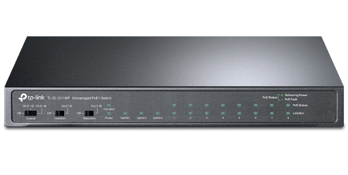 „8-Port 10/100Mbps + 3-Port Gigabit Desktop Switch with 8-Port PoE+ PORT: 8× 10/100 Mbps PoE+ Ports, 2× Gigabit Non-PoE Ports, 1× Gigabit SFP Slots SPEC: 802.3at/af, 124 W PoE Power, Desktop Steel Case FEATURE: Extend Mode for 250m PoE Transmitting, Isolation Mode, PoE Auto Recovery, Plug and Play”