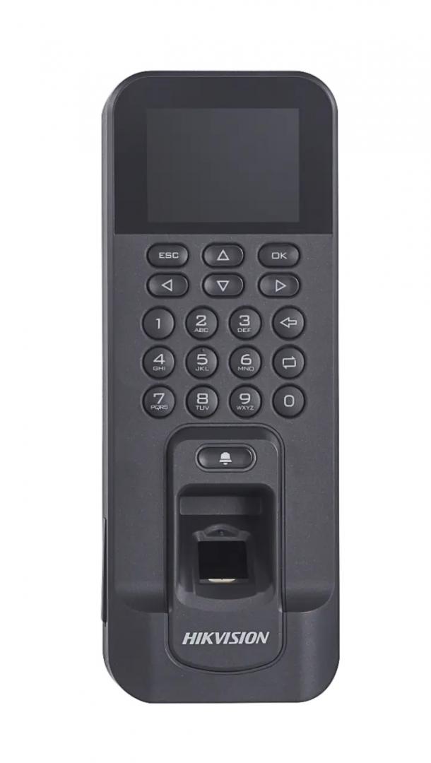 Controler de acces biometric stand alone Hikvision cu tastatura si cartele de proximitate MIFARE, DS-K1T804AMF; Capacitate de stocare: 3,000cartele, 3,000 amprente si 100,000 evenimente; Suporta functii de Access Control si  Time Attendance; display LCD2.4-inch; Distanta de citire: 0-5cm; Comunicare: TCP/IP, RS-485, WIFI, Wiegand 26/34; Intrari: alarmax1, senzor usa x1, buton iesire x1; Iesire: releu x1, alarma x1; Alimentare 12 VDC/2 A; Dimensiuni: 205mm × 76.5mm × 37mm.
