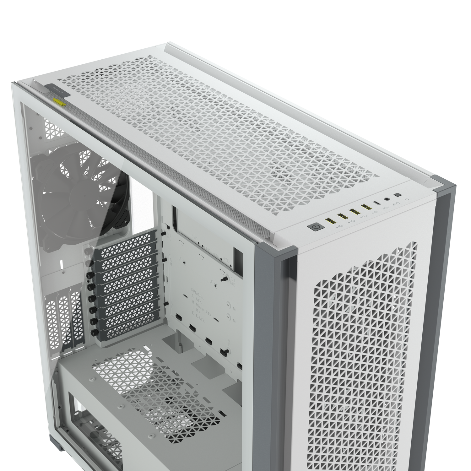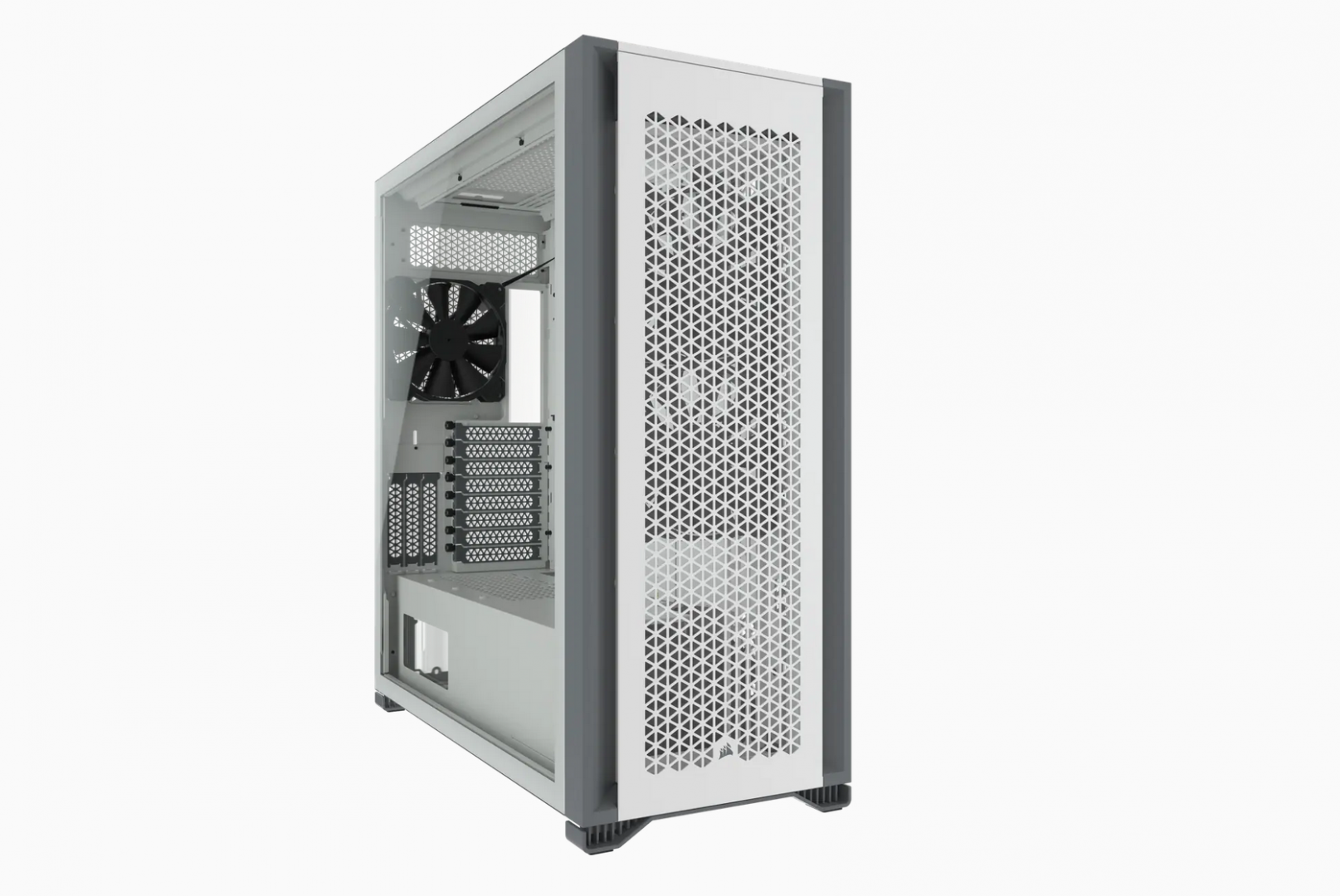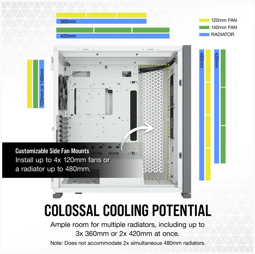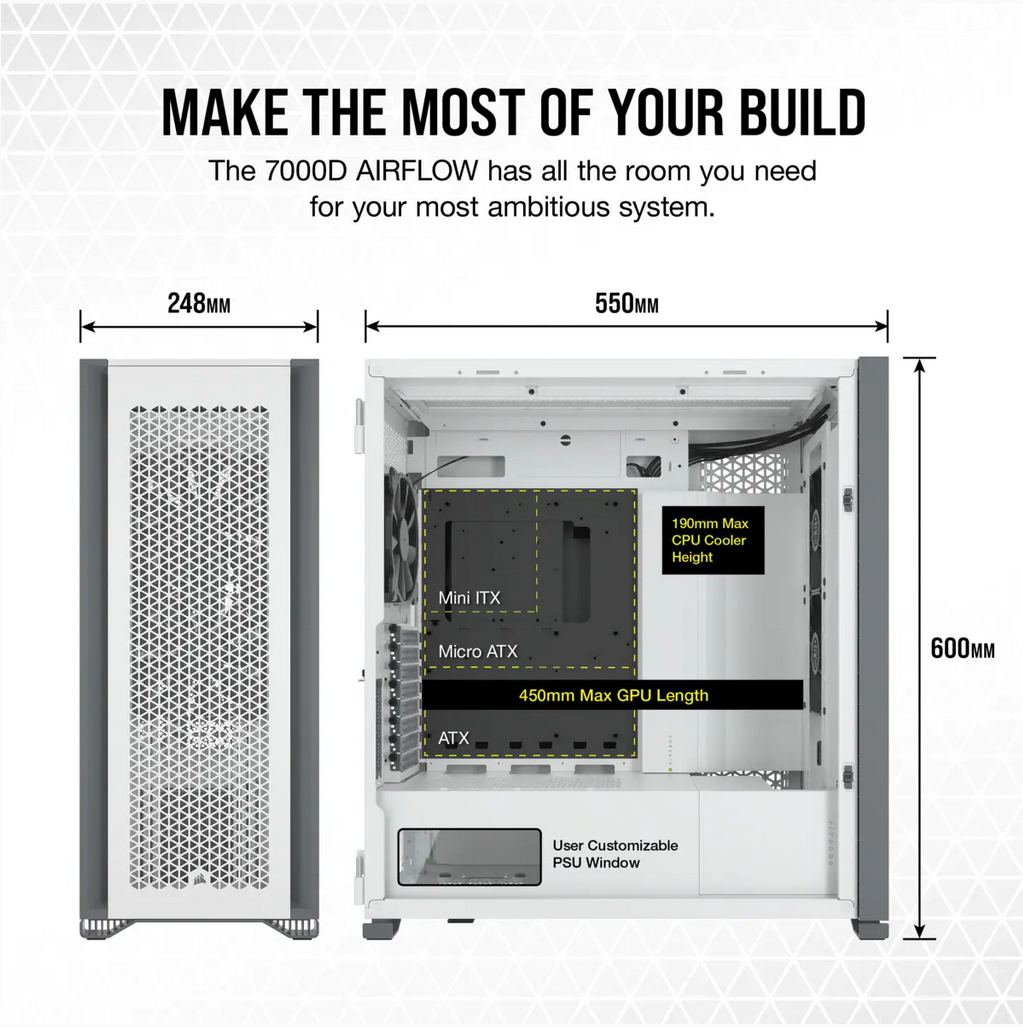 Carcasa Corsair 7000D AIRFLOW Full-Tower ATX PC Case — White Maximum GPU Length 450 mm Maximum PSU Length 225 mm Maximum CPU Cooler Height 190 mm Expansion Slots 8 horizontal + 3 vertical Case Drive Bays (x6) 3.5in (x4) 2.5in Form Factor FULL TOWER Case Windowed Tempered Glass Case Warranty 2 Year Color White Radiator Compatibility 120mm, 140mm, 240mm, 280mm, 360mm, 420mm, 480mm Case Front IO (4x) USB 3.0, (1x) USB 3.1 Type C, (1x) Audio in/out Compatible Corsair Liquid Coolers H55, H60, H75, H80i, H90, H100i, H105, H110i, H115i, H150i, H170i Case Power Supply ATX Weight 18.7 Height 600 mm Length 550 mm Width 248 mm https://www.corsair.com/us/en/Categories/Products/Cases/Super-Tower-and- Full-Tower-Cases/7000D-AIRFLOW-Full-Tower-ATX-PC-Case/p/CC-9011219-WW
