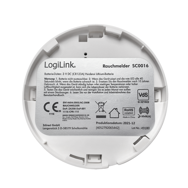 Detector de fum LOGILINK, montare tavan/ perete, senzor: fotoelectric, alarma 85 dB, buton test, baterie 3V, VdS, alb