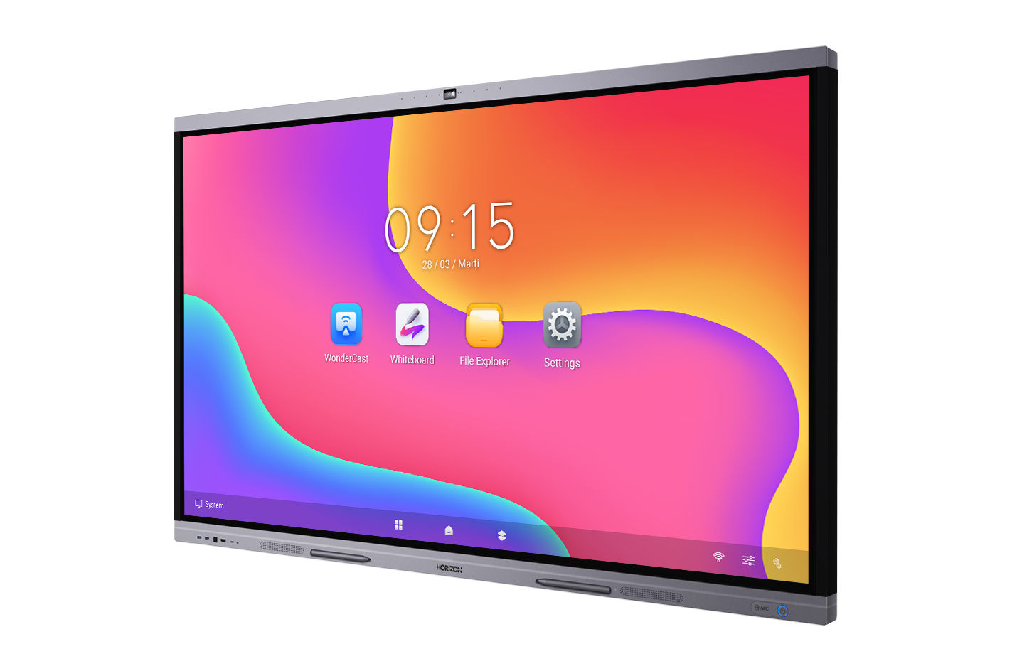 Display interactiv HORIZON Seria A3C, 75″ , 4K UHD, Android 13, 8GB RAM, stocare 128GB, 45 puncte touch, camera 8MP, microfon 8 zone