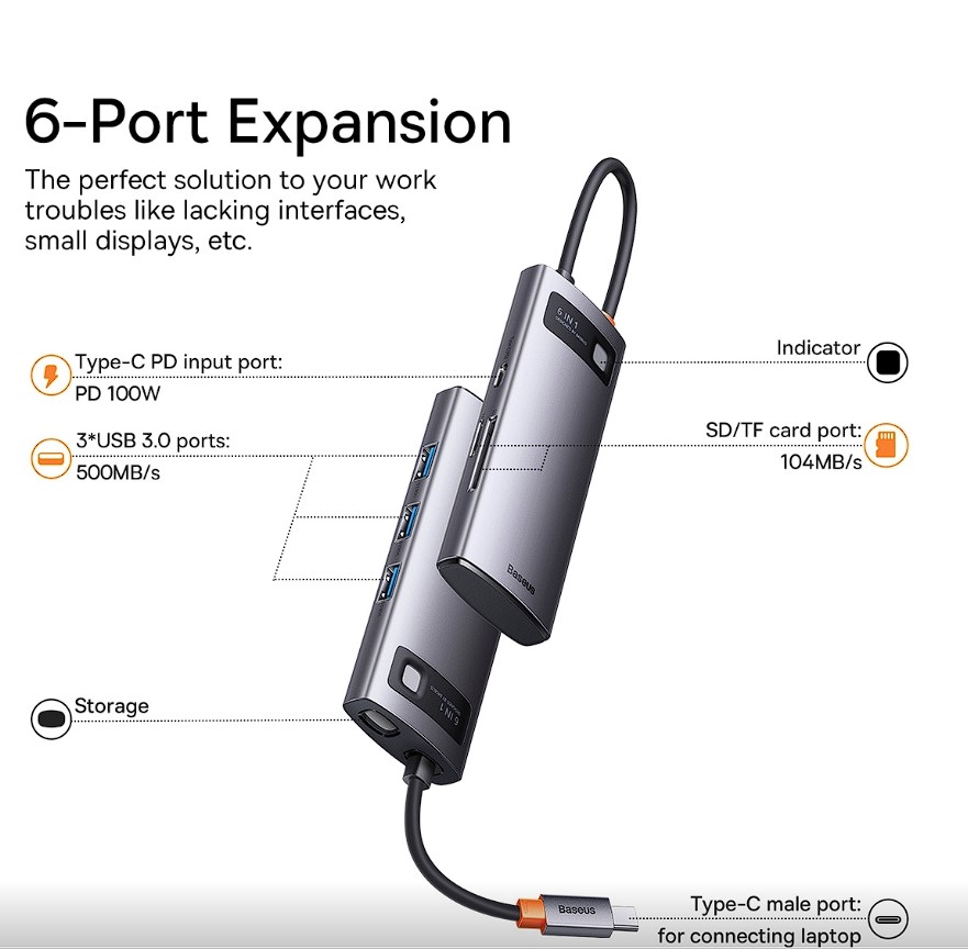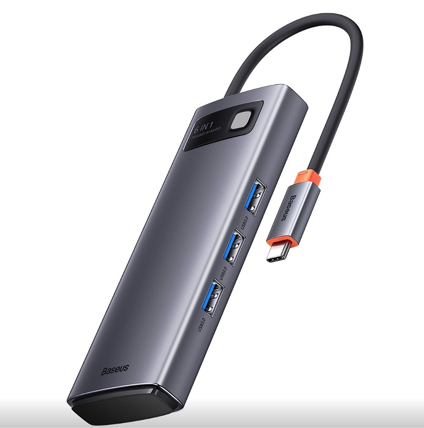 DOCKING Station Baseus Metal Gleam, conectare PC USB Type-C, USB 3.0 x 3, USB Type C x 1 PD 20V/5A, card reader SD/microSD, gri „WKWG030213” (timbru verde 0.18 lei) – 6932172608231