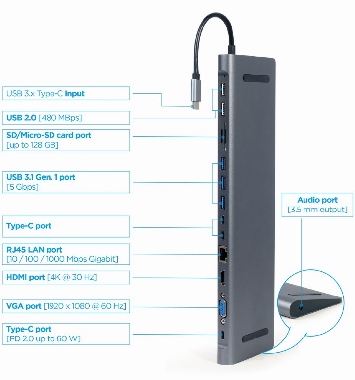 Docking station Gembird, USB Type-C 9-in-1 multi-port adaptor(USB hub + HDMI + VGA + PD + card reader + LAN + 3.5 mm audio), space grey