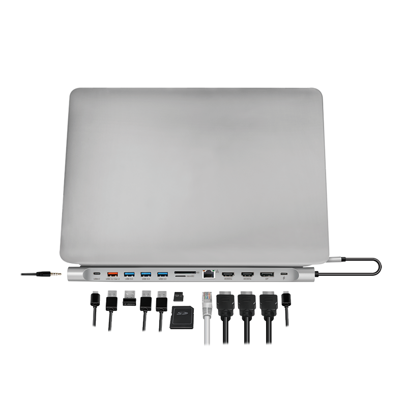 DOCKING Station LOGILINK universal, conectare PC USB TYPE-C 3.2, USB-C PD x 1, USB-C x 1, USB-A 3.0 x 3, porturi video DP x 1, HDMI x 2, RJ-45, 3.5mm x 1, card reader, PD 3.0 pana la 100W, argintiu, „UA0411” (timbru verde 0.18 lei)