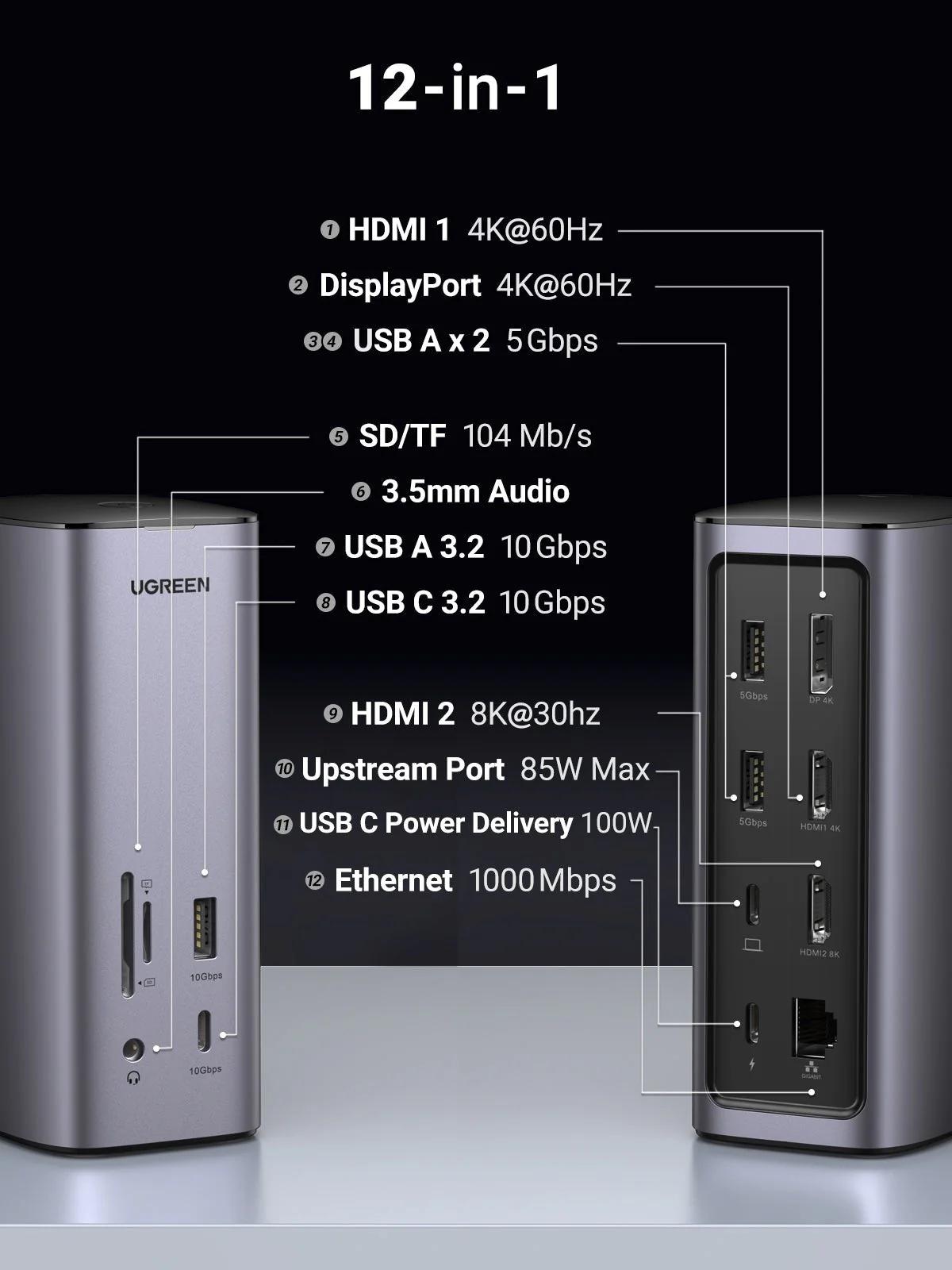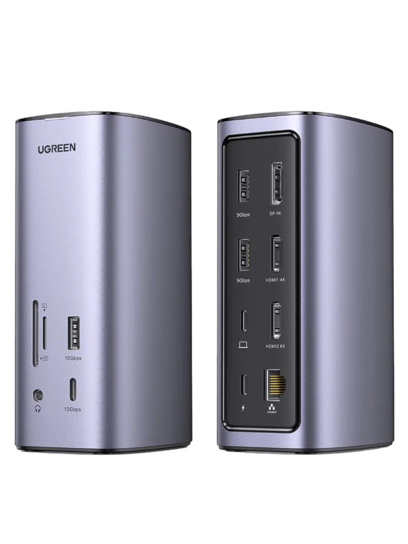 DOCKING Station Ugreen, „CM555” conectare PC USB Type-C, 1 x jack 3.5mm, SD/microSD Card Slot, 1 x DP Port 4K@60Hz, 1 x RJ-45 Gigabyte, 2 x HDMI 4K, 1 x USB Type-C PD 100W, 2 × USB-A 3.2 Gen 1, aluminiu, gri „90325” (timbru verde 0.8 lei) – 69573038