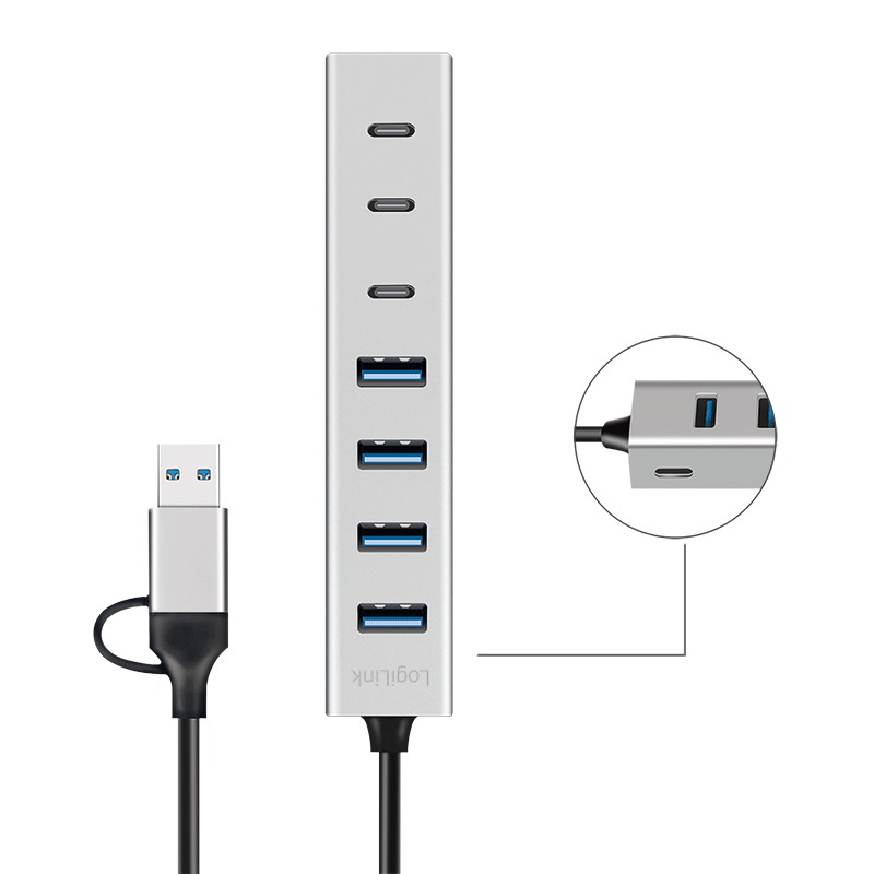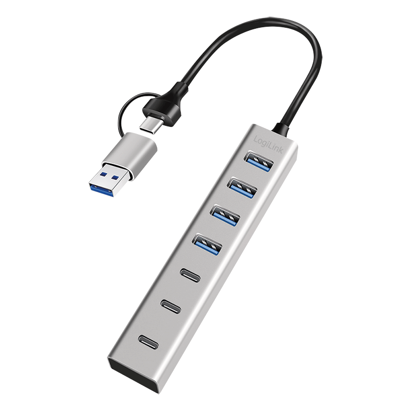 HUB extern LOGILINK, porturi USB: USB 3.0 x 4 + USB-C Type-C x 3, conectare prin USB-C 3.0, adaptor conectare USB-A, metal, argintiu