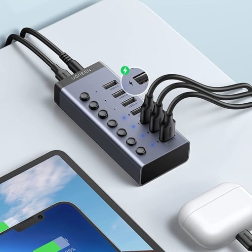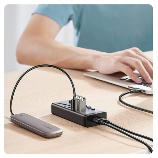 HUB extern Ugreen, „CM481” porturi USB: USB 3.0 x 7, conectare prin USB Type-C, alimentare separata, aluminiu, lungime 15 cm, gri, „90307” (timbru verde 0.8 lei)