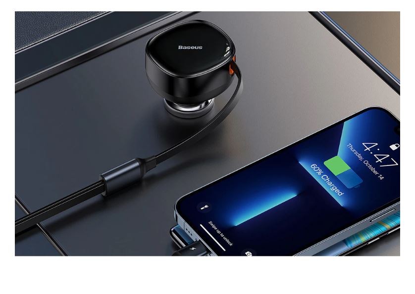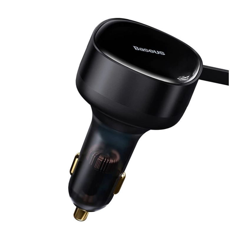 Incarcator auto retractabil 2 in 1 Baseus Enjoyment, AFC, FCP, cablu retractabil incorporat, Lightning+Type-C, 30W, negru