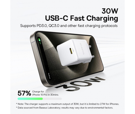 INCARCATOR retea Baseus Palm, Quick Charge 30W, 1 x USB Type-C, alb „P10111605213-00” (timbru verde 0.18 lei) – 6932172672768