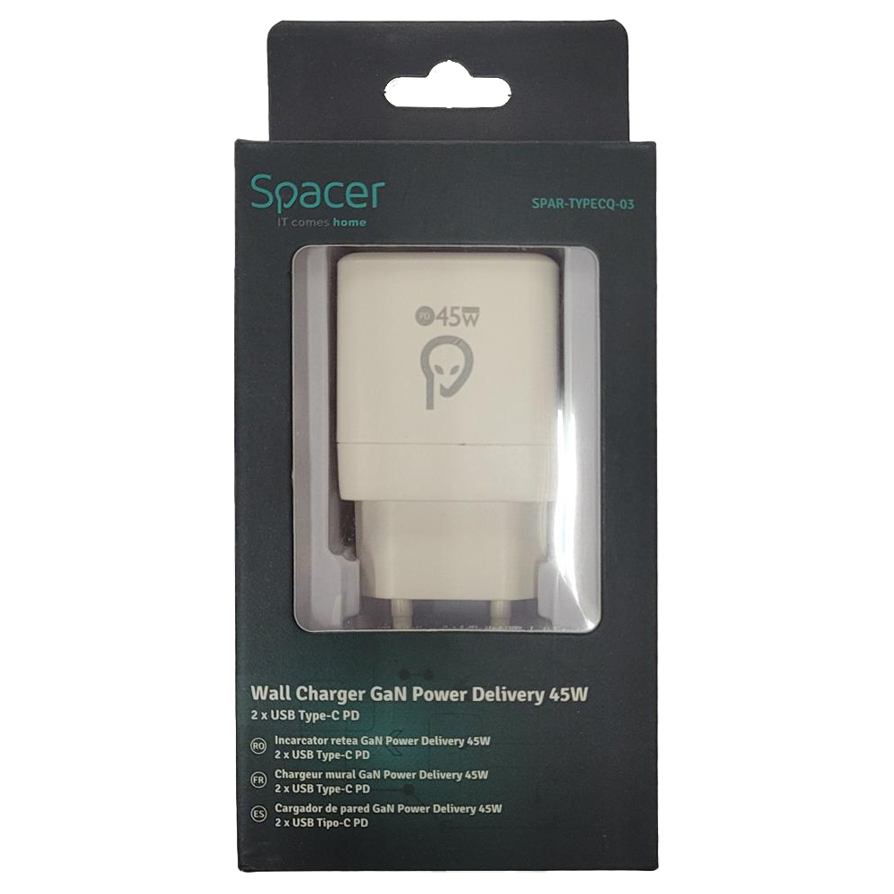 Încărcător rețea Spacer, 2 x USB Type-C, Power Delivery, GaN, 45W