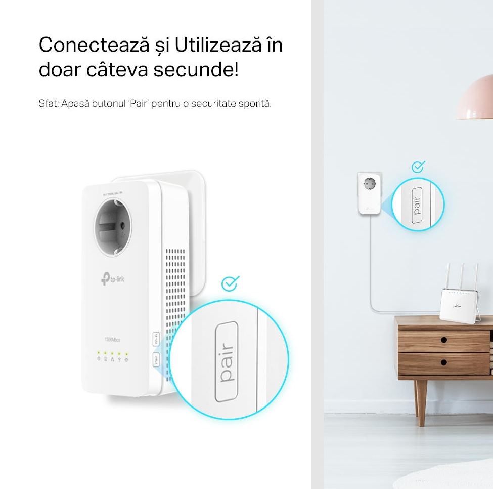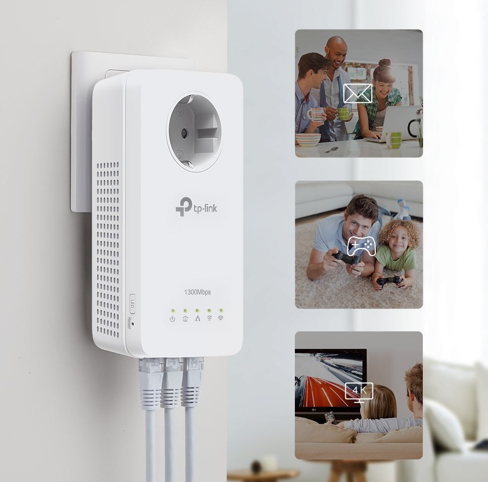 AV1300 Gigabit Passthrough Powerline AC1200 Wi-Fi Kit KIT: 1× TL-WPA8631P + 1× TL-PA8010P TL-WPA8631P: SPEED: 300 Mbps at 2.4 GHz + 867 Mbps at 5 GHz, 1300 Mbps Powerline SPEC: Qualcomm CPU, 3× Gigabit Ports, AC-Passthrough, Wall Plugged, HomePlug AV2 FEATURE: Plug and Play, tpPLC Utility, tpPLC APP, One-Touch Wi-Fi Configuration, Auto-Sync Wi-Fi Setting, OneMesh, 2×2 MIMO (PLC), Pair for More Security, LED On/Off Button TL-PA8010P: SPEED: 1300 Mbps Powerline SPEC: Qualcomm CPU, 1× Gigabit Ports, AC-Passthrough, Wall Plugged, HomePlug AV2 FEATURE: Plug and Play, tpPLC Utility, 2×2 MIMO (PLC), Power Saving, Pair for More Security