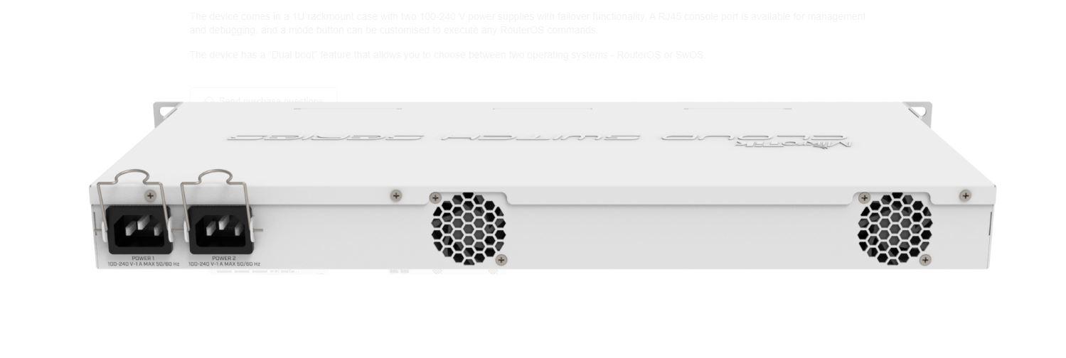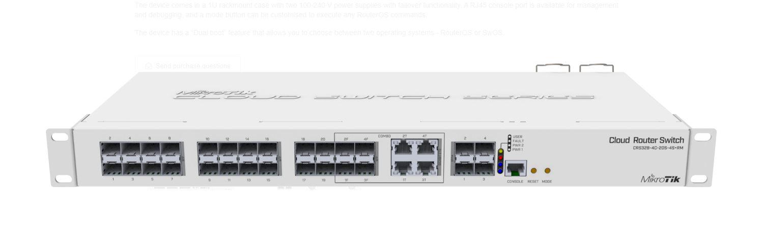 Mikrotik Cloud Router Switch, CRS328-4C-20S-4S+RM; Smart Switch, 20 xSFP cages, 4 x SFP+ cages, 4 x Combo ports (Gigabit Ethernet or SFP),800MHz CPU, 512MB RAM, 1U rackmount case, Dual Power Supplies, RouterOSL5 or SwitchOS (Dual Boot); Max power consumption: 43 W;