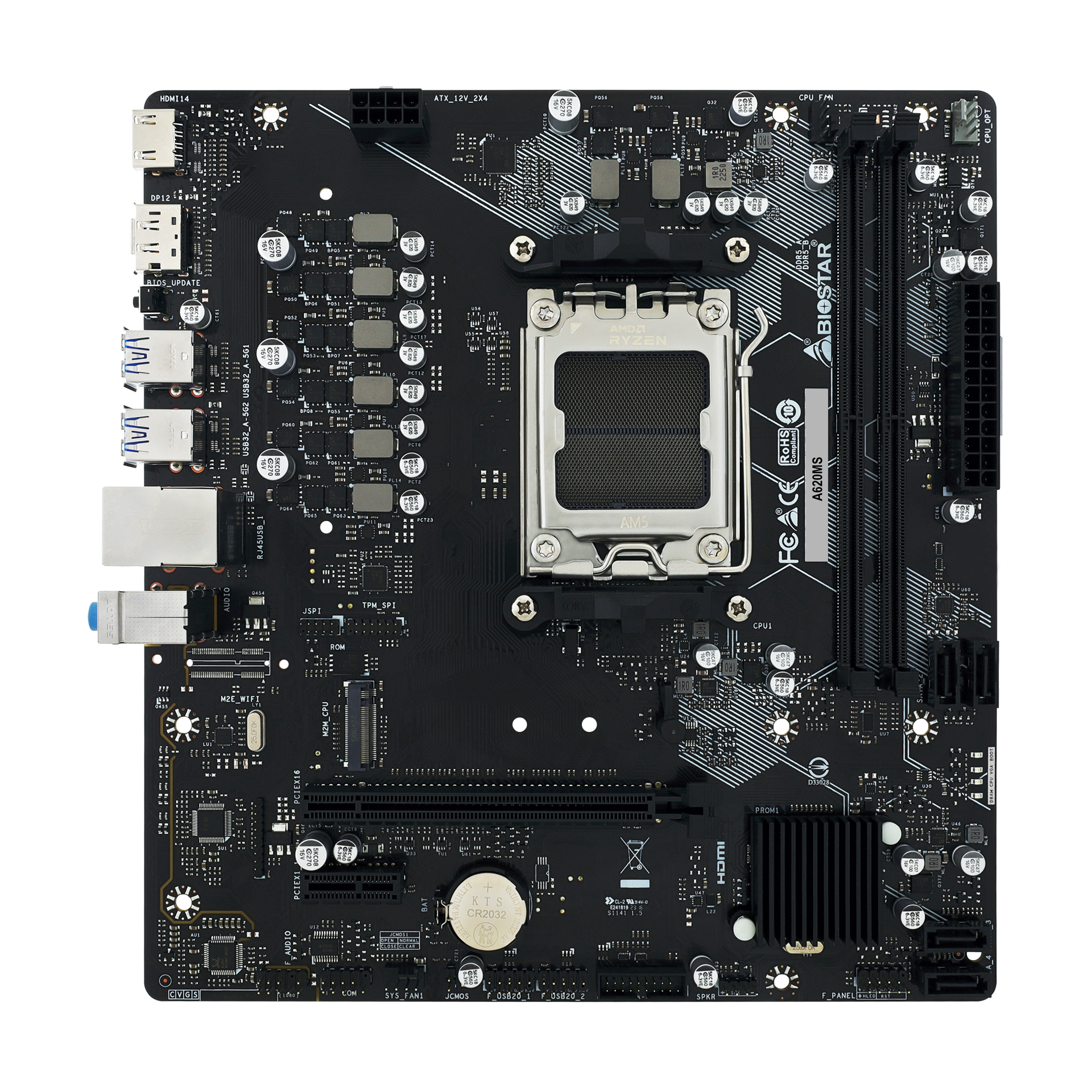 Biostar A620MS. Processor manufacturer: AMD, Processor socket: Socket AM5, Compatible processor series: AMD Ryzen 7000 Series, AMD Ryzen 8000 Series, AMD Ryzen 9000 Series. Supported memory types: DDR5-SDRAM, Maximum internal memory: 128 GB, Memory slots type: DIMM. Supported storage drive interfaces: SATA III. Ethernet interface type: Gigabit Ethernet, LAN controller: Realtek RTL8111H. Component for: PC, Motherboard form factor: micro ATX, Motherboard chipset family: AMD