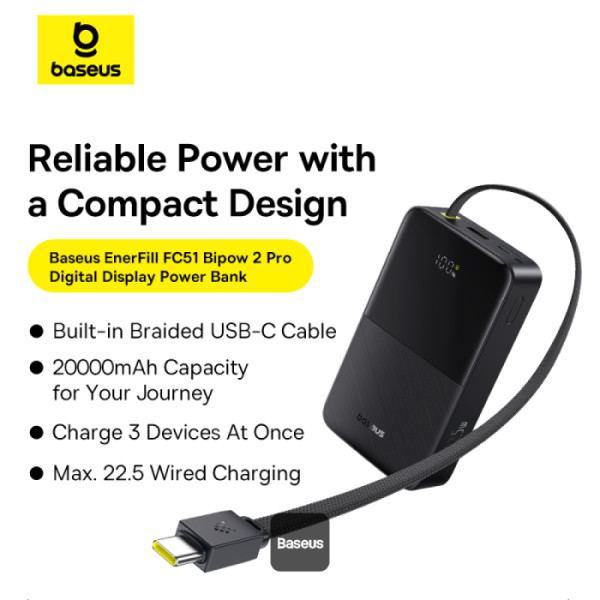 POWER BANK Baseus EnerFill FC51 Bipow2 Pro, 20000mAh, 22.5W, 1 x USB Type-C, 1 x USB, cablu integrat USB Type-C 22cm, negru, „E0027701” (timbru verde 0.98 lei) – 6932172691899
