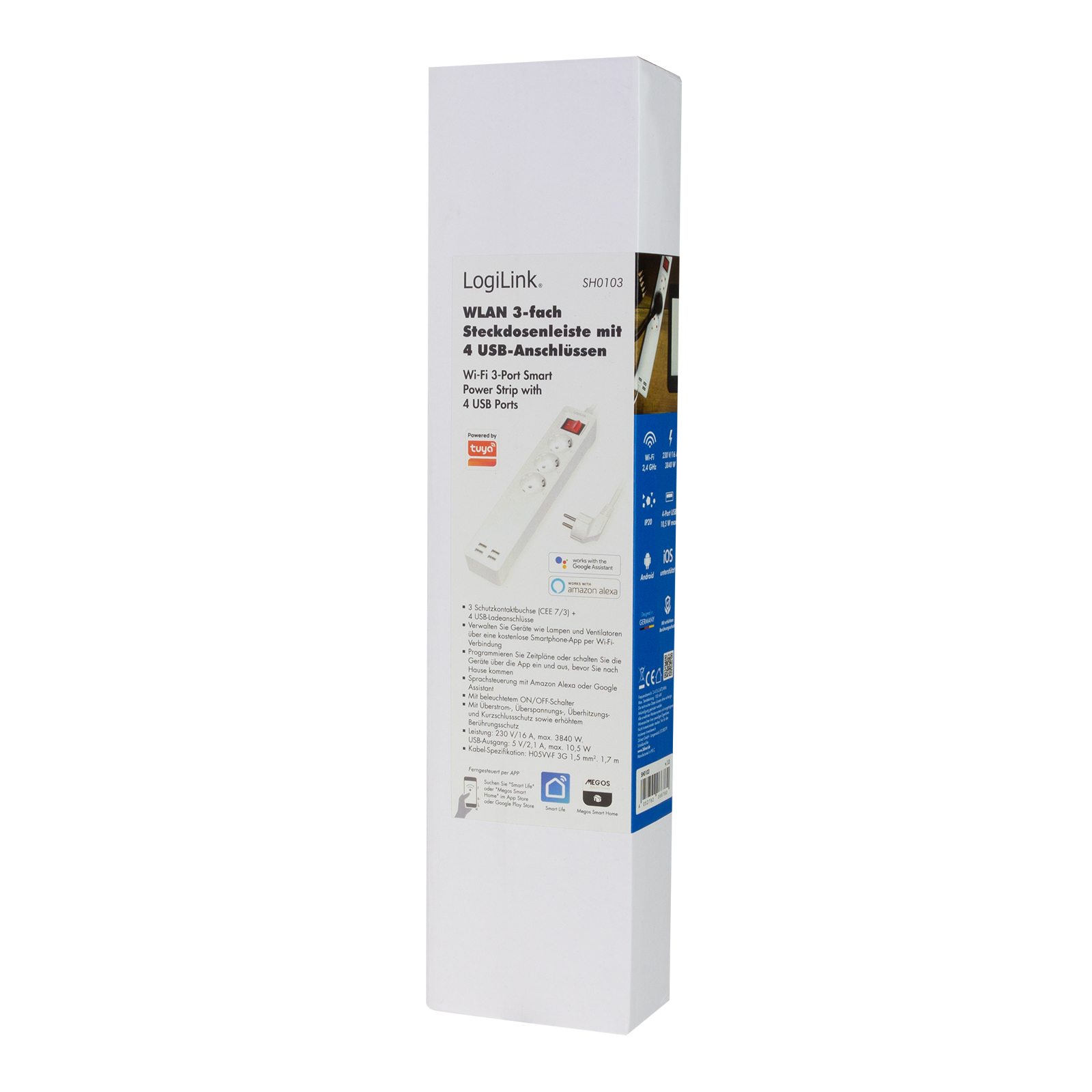 Prelungitor inteligent LogiLink SH0103, Wi-Fi, cu intrerupator, 3 prize, 4x USB-A 5 V/2.1 A (max. 10.5 W), protectie supracurent/supratensiune, IP20, compatibil TUYA, H05VV-F 3G 1.5 mm², cordon 1.7m, Alb