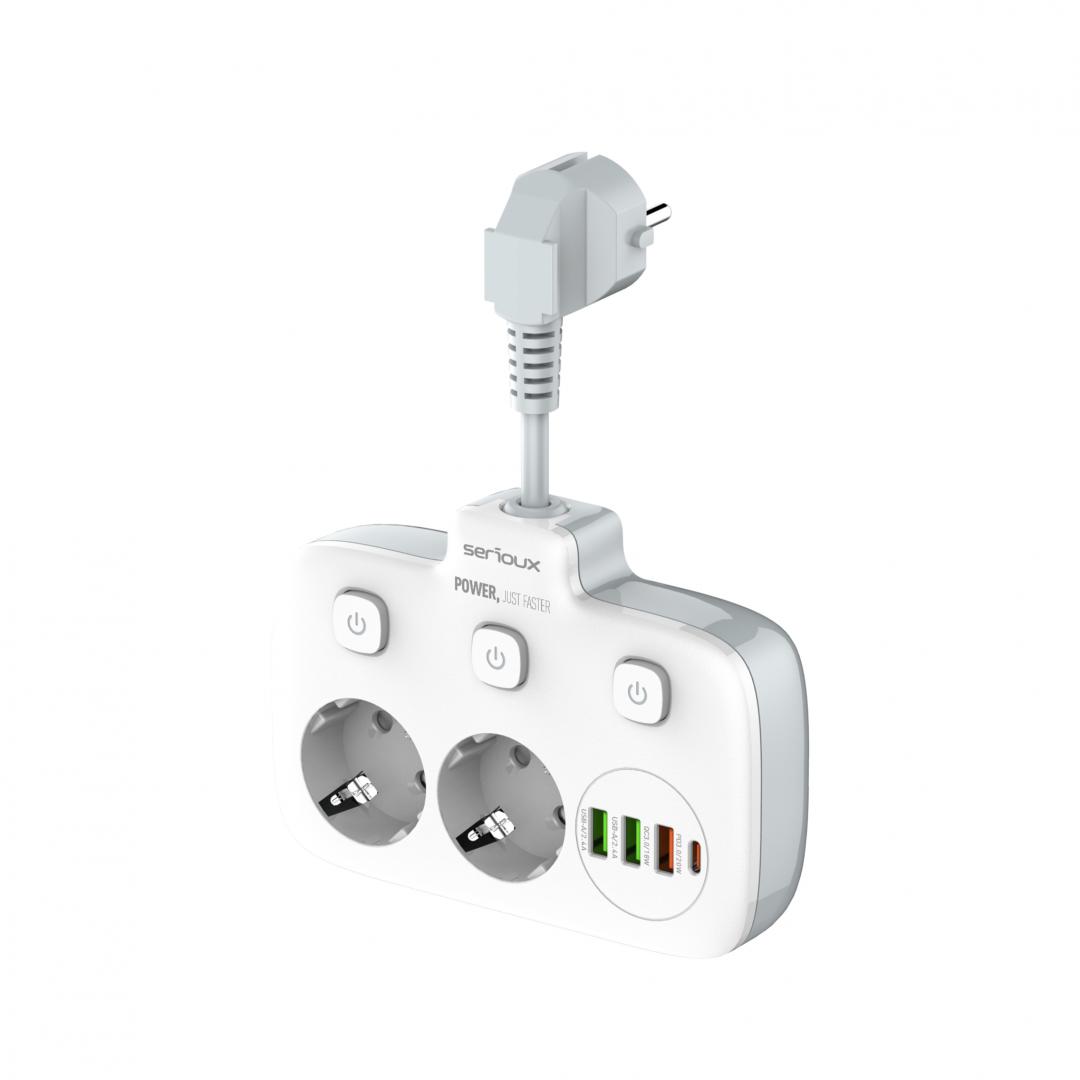 Priza multipla Serioux PS24W, 2 prize, 6xUSB, PD Type-C , QC3.0, intrerupator, protectie supratensiune