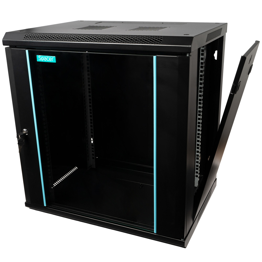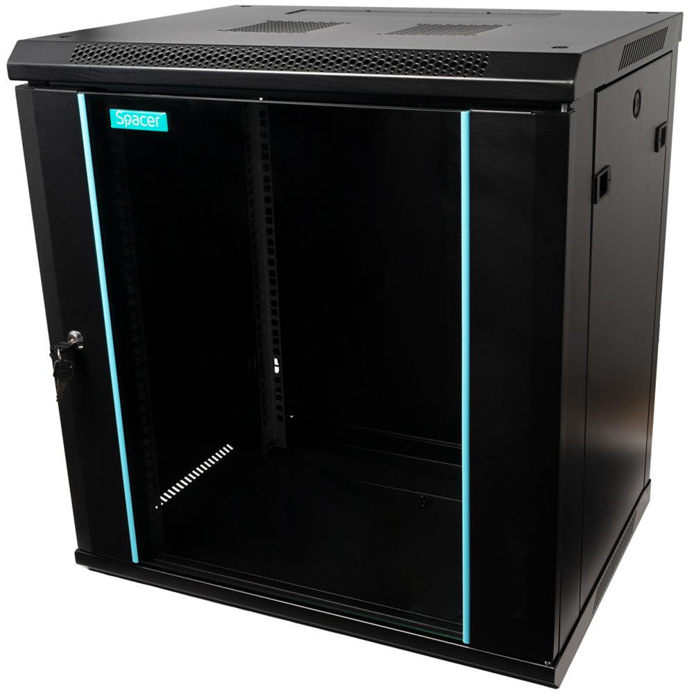 CABINET 19″ SPACER 12U 600x450mm, fixare pe perete, Flatpack (dezasamblat), Black, usa sticla cu blocare, panouri detasabile, otel 1.5mm, sarcina maxima 60Kg