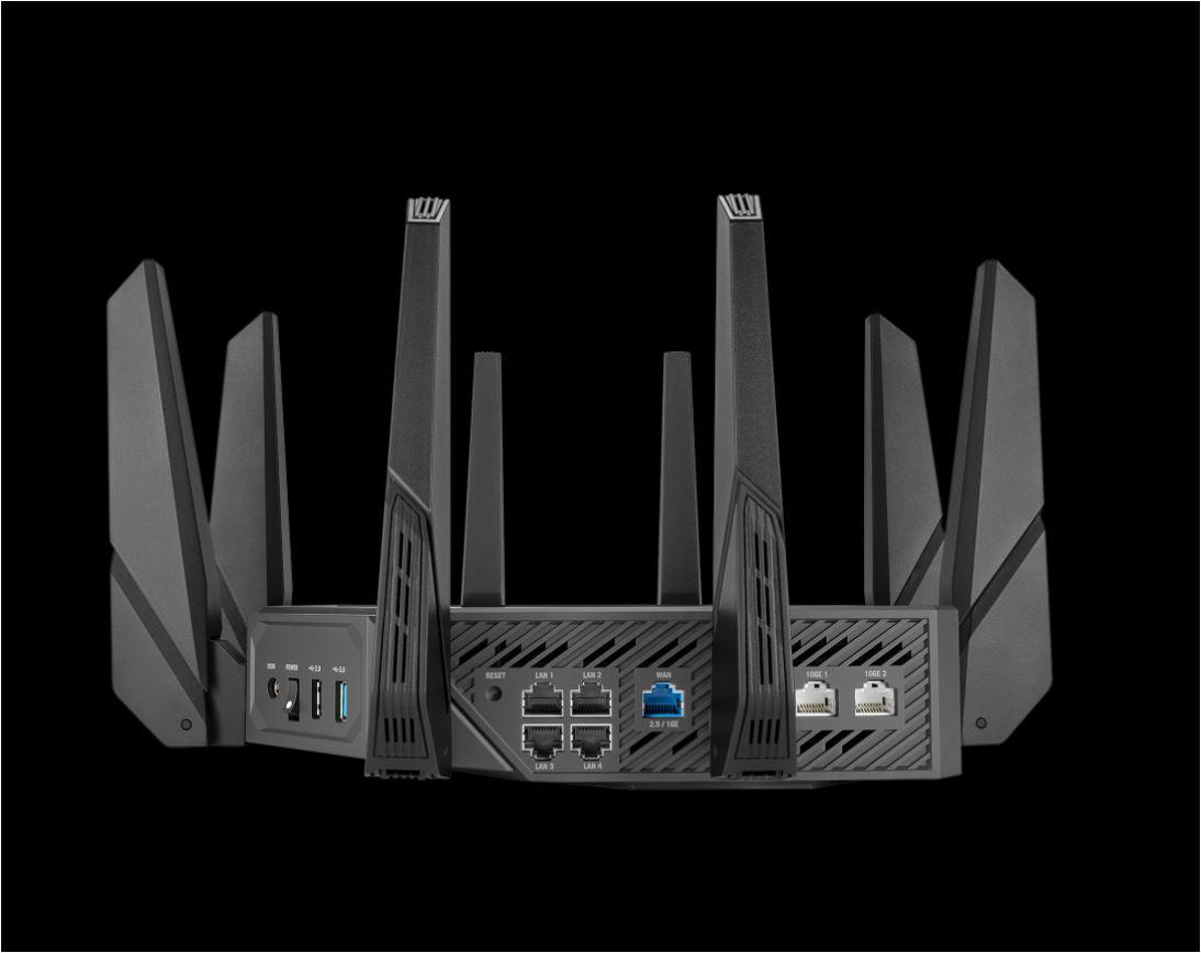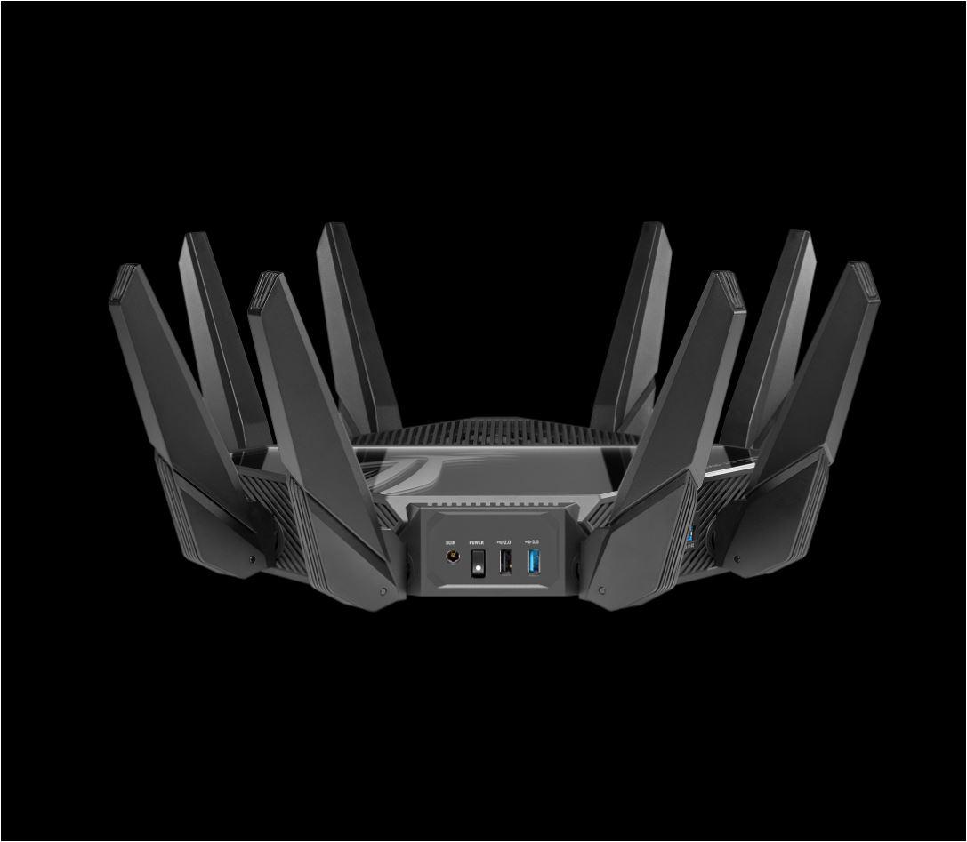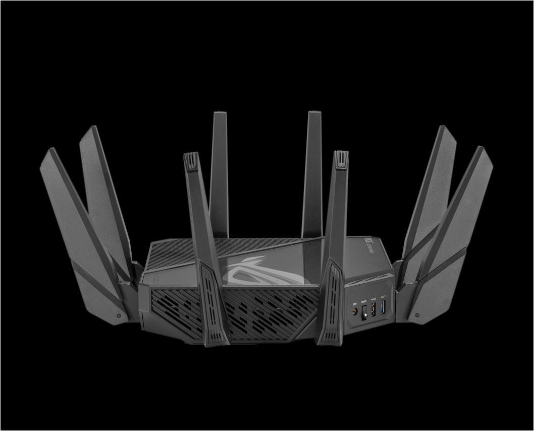 Asus Quad-band WiFi Gaming Router GT-AXE16000; Network Standard: WiFi 6 (802.11ax), WiFi 6E (802.11ax), Backwards compatible with 802.11a/b/g/n/ac Wi-Fi, 2.4GHz 1148Mbps, 5G-1Hz 4804Mbps, 5G-2Hz 4804Mbps, 6GHz 4804Mbps, 8 antene externe, 4 antene interne, Procesor: 2.0Ghz, 256Mb flash, 2Gb RAM, Quad-band Wi-Fi: 2.4 GHz / 5 GHz-1 / 5 GHz-2 / 6 GHz. 1 x 2.5 Gigabit WAN Port 2 x 10 Gigabit WAN/LAN Ports 4 x Gigabit LAN Ports 1 x USB 3.2 Gen 1 Port 1 x USB 2.0 Port.