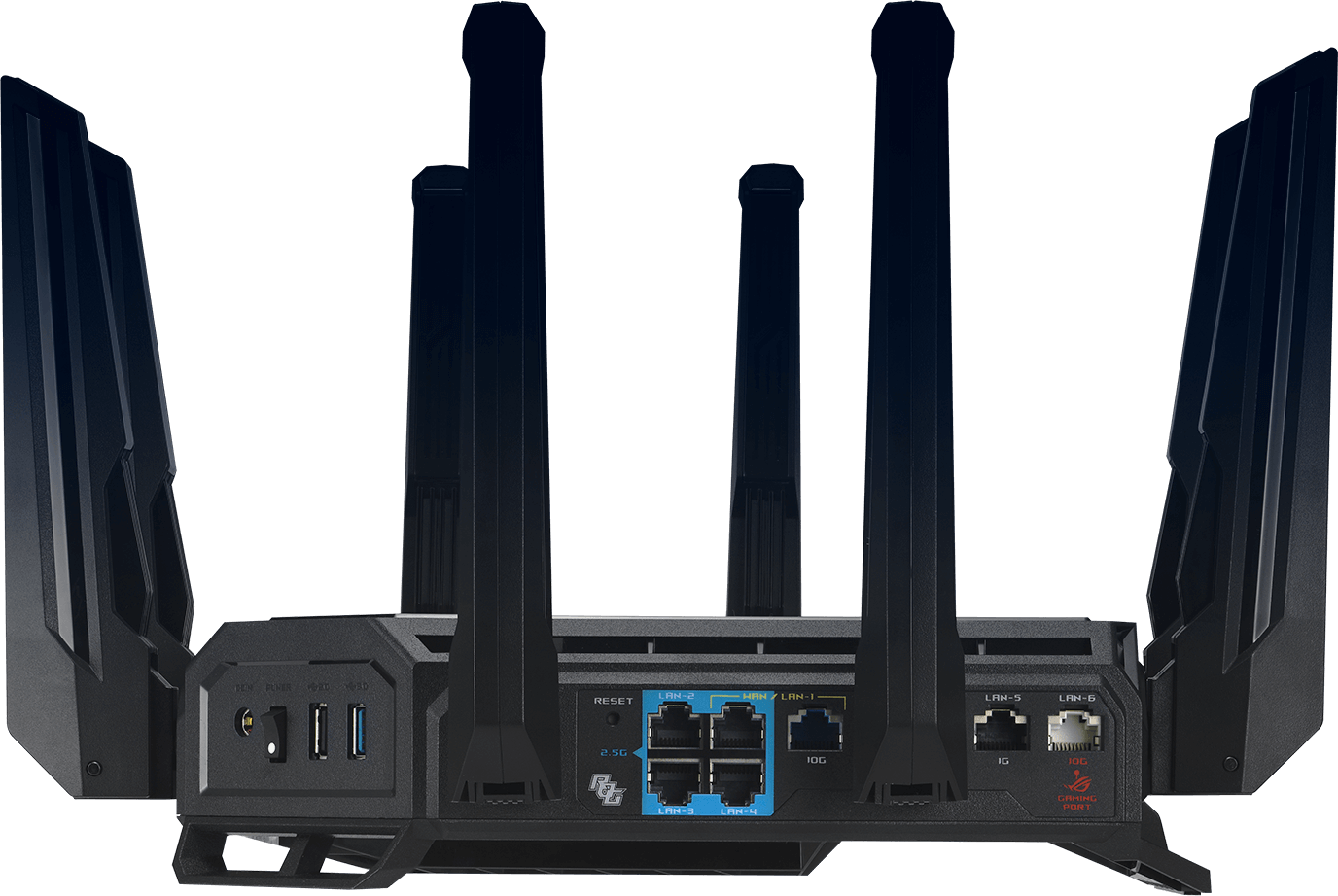 Router Asus Quad-Band ROG Rapture GT-BE98, WIFI-7, Standarde wireless: WiFi 6 (802.11ax), WiFi 7 (802.11be), IEEE 802.11a, IEEE 802.11b, IEEE 802.11g, IEEE 802.11n, IEEE 802.11ac, IPv4, IPv6, Segment Produs: BE25000, Viteza wireless: 1376+5764+5764+11529 Mbps, 8 x antene externe, Procesor: 2.6GHz quad-core, Memorie: 256 MB Flash and 2 GB RAM, Frecvente: 2.4 GHz / 5 GHz / 6 GHz, Interfata: 1 x 10Gbps for WAN/LAN 1 x 2.5Gbps for WAN/LAN, 1 x 10Gbps for LAN, 3 x 2.5Gbps for LAN, 1 x RJ45 10/100/1000Mbps for LAN, 1 x USB 3.2 Gen1, 1 x USB 2.0