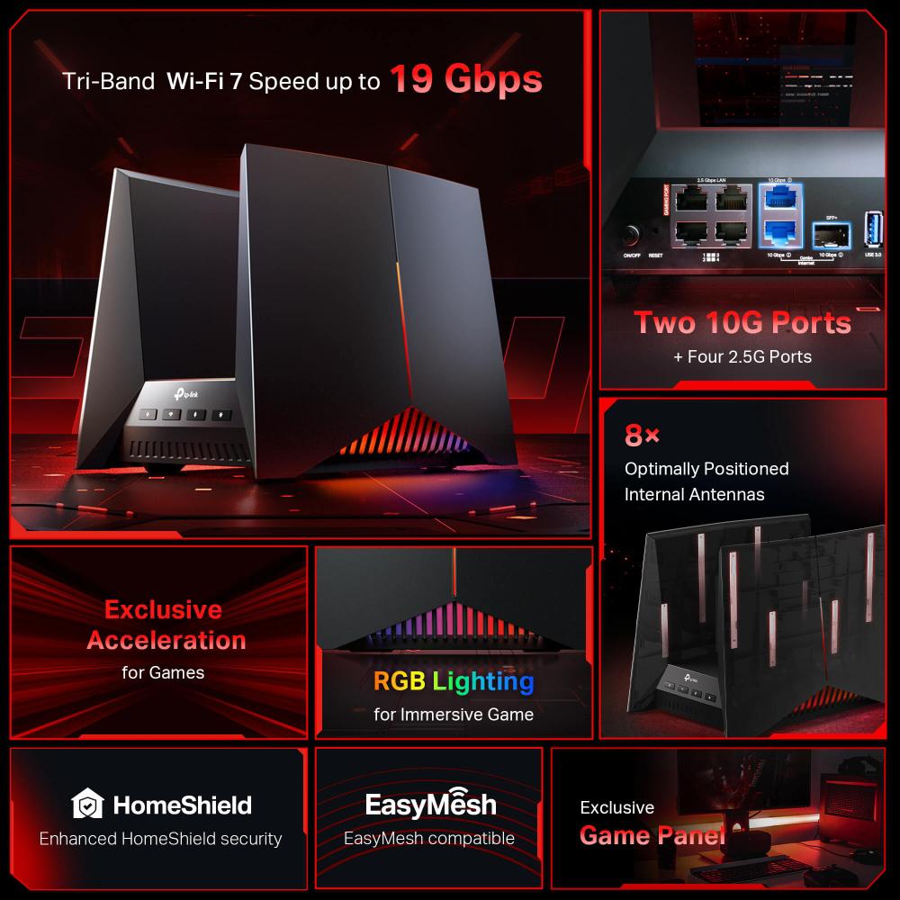 Router Gaming Wireless TP-Link Archer GE800, BE19000 , Tri-Band, 2 x 10Gbps + 4 x 2.5 Gbps porturi, 1 x USB 3.0, Accelerare exclusiva pentru jocuri, Panou dedicat pentru functii gaming, HomeShield, compatibil EasyMesh