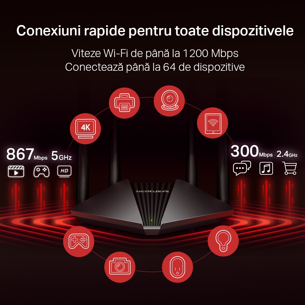 Router Wireless MERCUSYS MR30G, Dual-Band Gigabit AC1200, Wireless Standards: IEEE 802.11ac/n/a 5 GHz, IEEE 802.11b/g/n 2.4 GHz, WiFi Speeds:867 Mbps (5 GHz) + 300 Mbps (2.4 GHz), Router Mode, Access Point Mode, 1× Gigabit WAN Port + 2× Gigabit LAN Ports, 4× 5 dBi Fixed Omni- Directional Antennas.