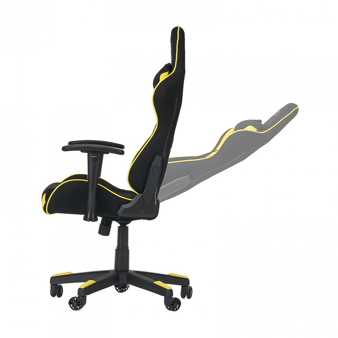 Scaun gaming X by Serioux, Torin, ajustabil, material textil, piston pe gaz, manere reglabile, baza stea cu 5 picioare, greutate maxima admisa150Kg, perne detasabile, negru si galben