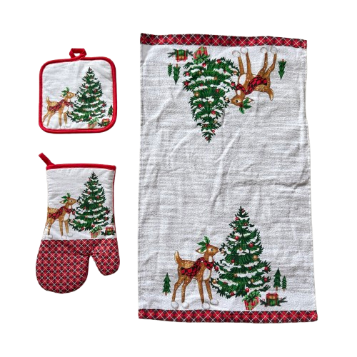 Setul contine : un suport pentru vase fierbinti 17×17 cm, un prosop 38×63 cm , o manusa bucatarie 17×27 cm
