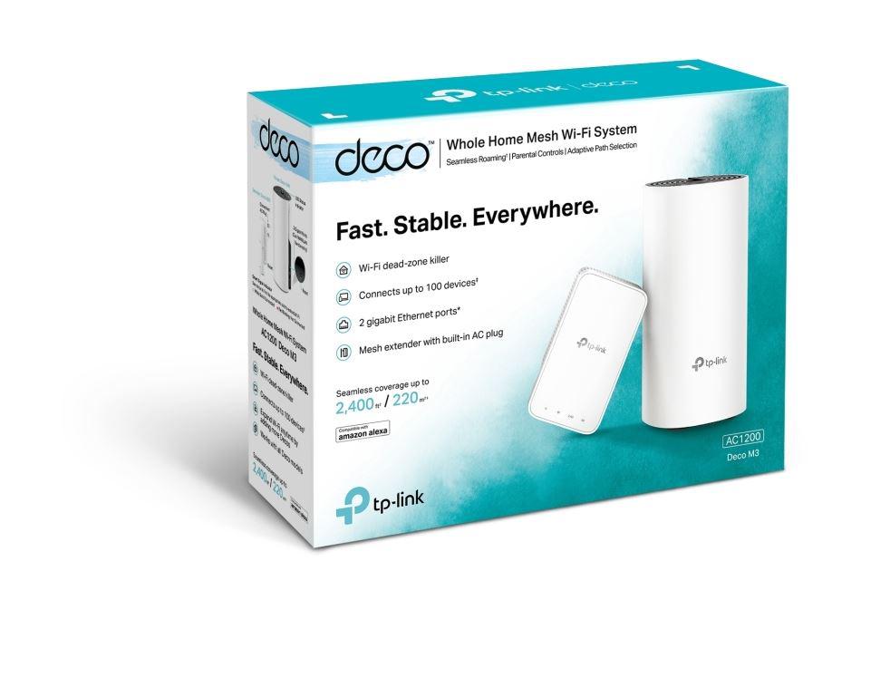 TP-Link Sistem Mesh gigabit Wi-Fi pentru întreaga casă AC1200, DECO M3 (2-PACK); Procesor: Qualcomm CPU; Interfață: 2 Gigabit Ethernet Ports (WAN/LAN)per Deco unit; 2 internal dual-band antennas per Deco unit; Flash: 16 MB; SDRAM: 128 MB; Standarde Wireless: IEEE 802.11 ac/n/a 5 GHz, IEEE 802.11 b/g/n 2.4 GHz; Frecvență: 2.4 GHz and 5 GHz; Rată de Semnal: 300 Mbps on 2.4 GHz, 867 Mbps on 5 GHz; Alimentare Externă: 12 V/1.2 A.