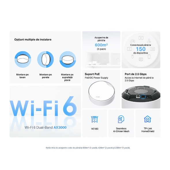 TP-Link AX3000 whole home mesh Wi-Fi 6 System, Deco X50-POE(3-pack); Dual- Band, Standarde Wireless: IEEE 802.11ax/ac/n/a 5 GHz, IEEE 802.11ax/n/b/g 2.4 GHz ,viteza wireless: 5 GHz: 2402 Mbps, 2.4 GHz: 574 Mbps, 2 x antene interne, 2×2 MU-MIMO, Mod Router, Mod Access Point, interfata: 3 x 10/100/1000, POE.