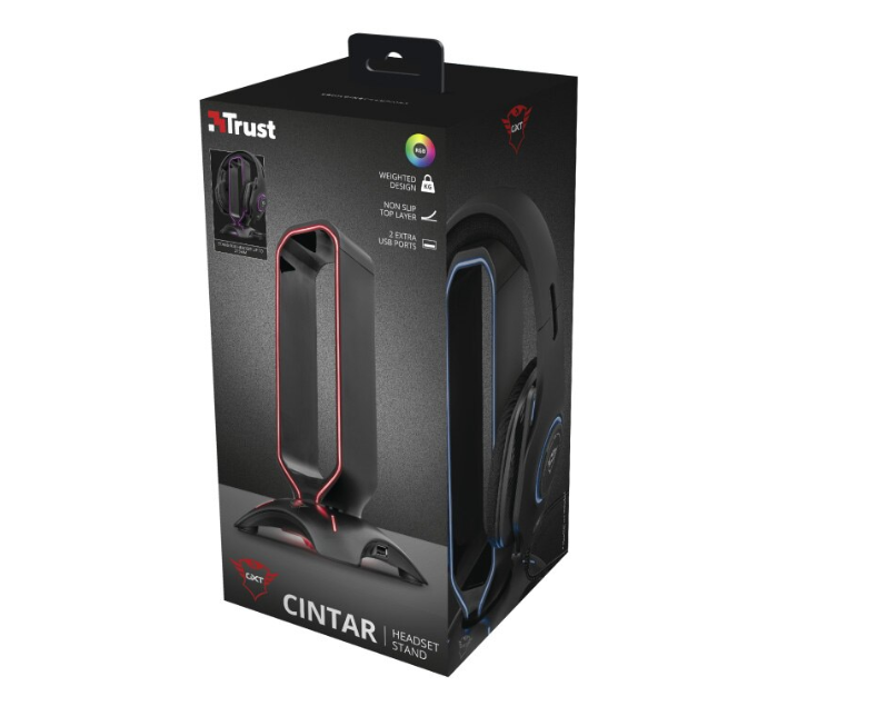 Suport casti Trust GXT 265 Cintar cu RGB, 2 porturi USB, lungime cablu 1.5m, dimensiuni: 130mm x 130mm x 255mm, negru