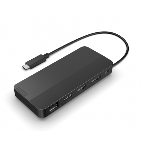 Lenovo USB-C Dual Display Travel Dock; Color: Eclipse Black; Weight: 137 g (0.3 lb); AC Plug: Type-C; Output Power: 65W; OS Requirements: Win 10, Win 11; USB Ports: 1 x USB-A 10 Gbps, 2 x USB-C 10 Gbps (1 x AOU 12W Max); Video Ports: 1 x HDMI 2.1, 1 x DP 1.4; Ethernet: 1x Gigabit Ethernet; Warranty: 3 Years; Input Power: 100W