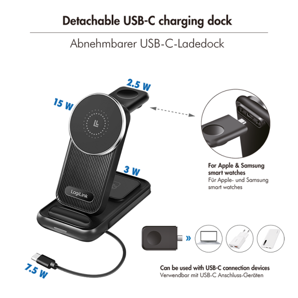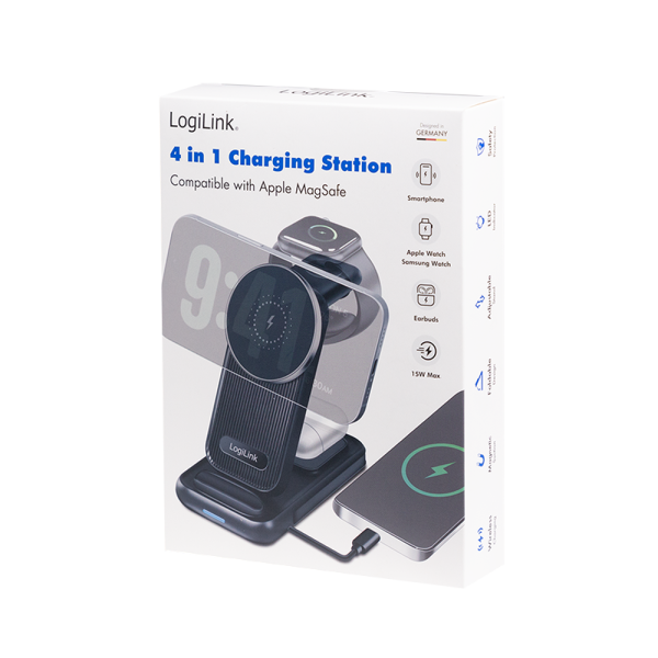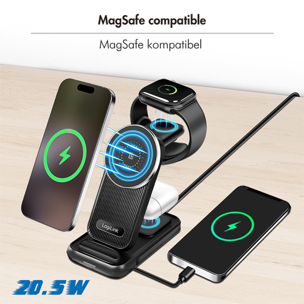 Statie de incarcare wireless USB-C 4 in 1 compatibila cu Apple MagSafe 20.5W Negru, Logilink, I-CHARGE-WR420
