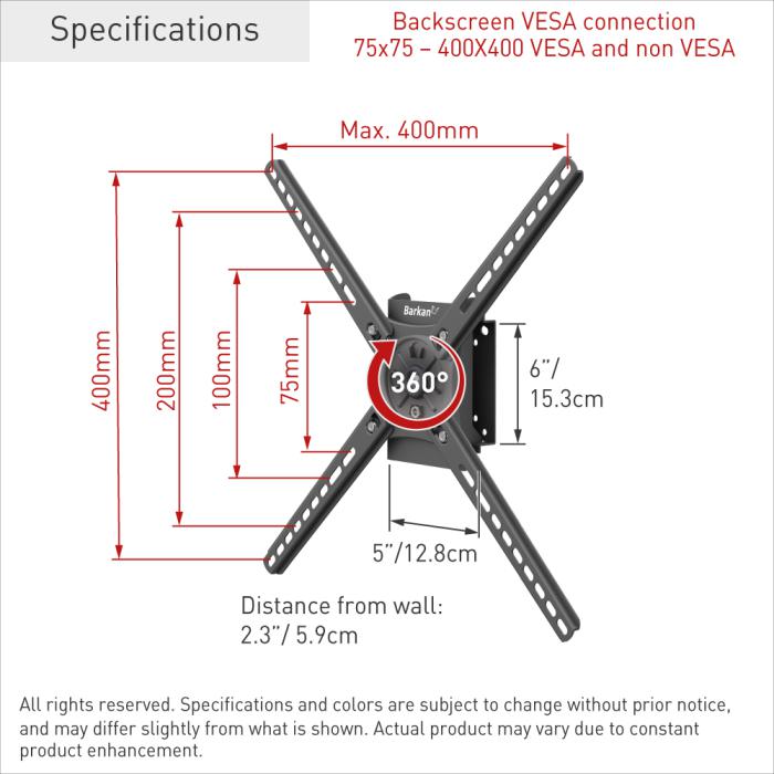 Suport TV perete Barkan, rotatie landscape si portret, dimensiune compatibila ecran 13-65″, greutate maxima suportata 36kg, VESA max 75x75mm-400x400mm, distanta fata de perete 2.3″/ 5.9cm, negru
