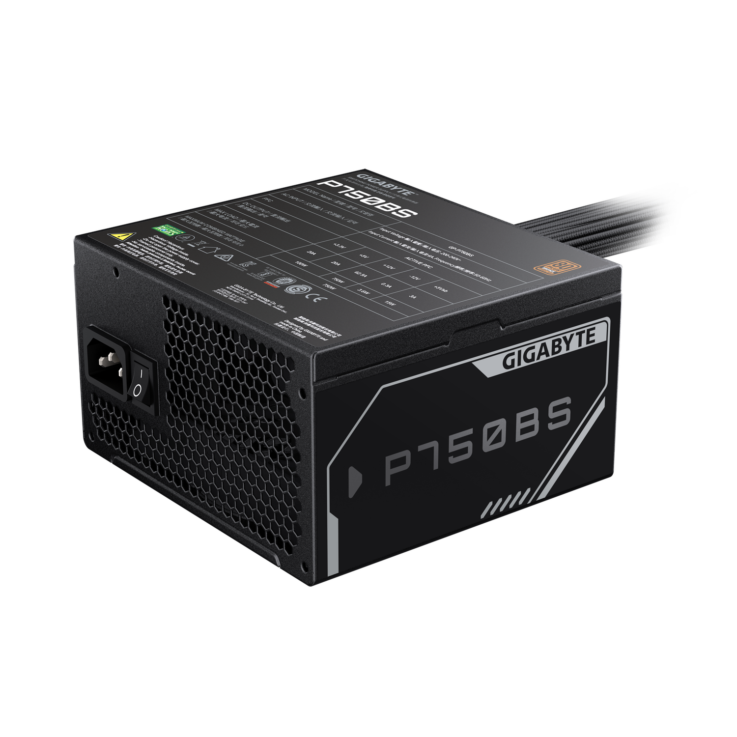 GIGABYTE P750BS. Total power: 750 W, AC input voltage: 200 – 240 V, AC input frequency: 50/60 Hz. Motherboard power connector: 20+4 pin ATX, Motherboard power cable length: 60 cm, SATA power cable length: 150,500 mm. Purpose: PC, Power supply unit (PSU) form factor: ATX, 80 PLUS certification: 80 PLUS Bronze. Product colour: Black, Cooling type: Active, Fan diameter: 12 cm. Width: 150 mm, Depth: 140 mm, Height: 86 mm