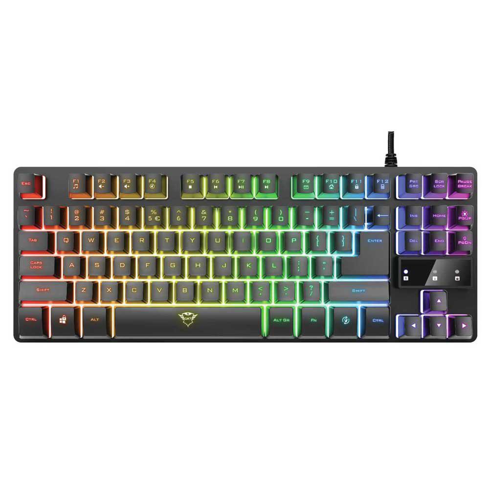 Tastatura Trust GXT 833 Thado TKL Illuminated Gaming Keyboard Specifications General Key technology membrane Height of main product (in mm) 40 mm Width of main product (in mm) 359 mm Depth of main product (in mm) 135 mm Total weight 709 g Weight of main unit 688 g Full Size keyboard no Ergonomic design no Connectivity Connection type wired Cable length main cable 150 cm Bluetooth no USB version 2.0 Connector type USB-A male Features Spill-proof no Silent keys no On-board memory yes Wrist support no Software no Special features TKL size Gaming Designed for gaming yes Gaming mode yes Lighting Backlight yes Backlight colours Green Yellow Key colours Rainbow Characteristics Keyboard layout QWERTY Input Power source USB Compatibility Compatible Device Types gaming console, pc, laptop Compatible Consoles PS4, Xbox One, Nintendo Switch Compatible Software Platforms Windows Control Numeric Key Pad no Trackpad no Media keys 12 Macro keys no Programmable keys no Special keys no Number of keys 87 Life time of key 5000000 presses Anti-Ghosting yes Macro programming no Indicators Caps-lock, Scroll-lock, Num-lock https://www.trust.com/en/product/23698-gxt-833-thado-tkl-illuminated- gaming-keyboard