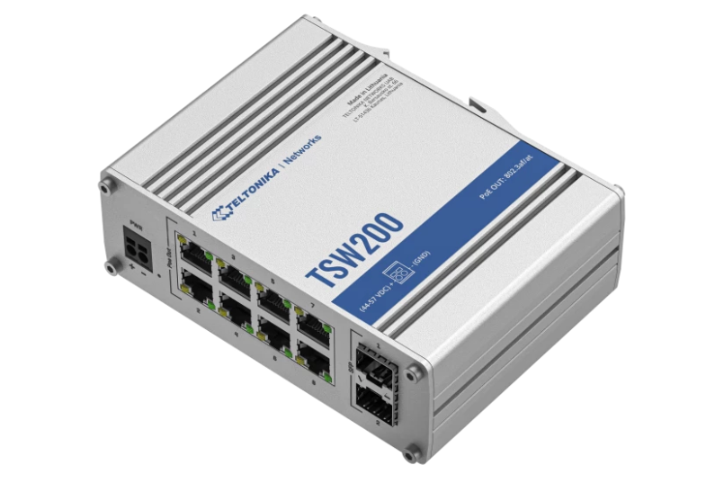 TELTONIKA INDUSTRIAL 8Port Unmanaged POE TSW200, Interfata: 8 x ETH ports, 10/100/1000 Mbps, supports auto MDI/MDIX crossover, 2 x SFP ports, Standarde wireless: 802.3i, 802.3u, 802.3ab, 802.3x, 802.3az, 802.3ad, Porturi POE: 1-8, Buget POE: 240W, Latime de banda: 20 Gbps, Carcasa aluminiu, Dimensiuni: 132 x 44.2 x 95.1 mm, Greutate: 517 g, IP30.